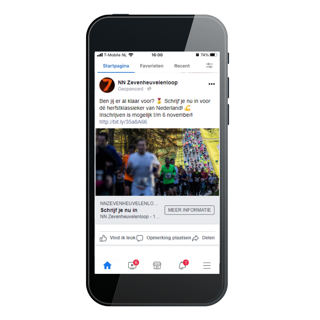Belangrijk onderdeel van social advertising is het vinden van de juiste doelgroep. Wie doet er nou eigenlijk mee aan zo'n hardloopwedstrijd? Wij hebben deze doelgroep onder andere gevonden door hardlopers te targeten en gebruik te maken van look-a-like audiences. Door remarketing campagnes in te richten blijven we lopers die geïnteresseerd zijn in een van de evenementen, volgen en inspireren om zich in te schrijven.